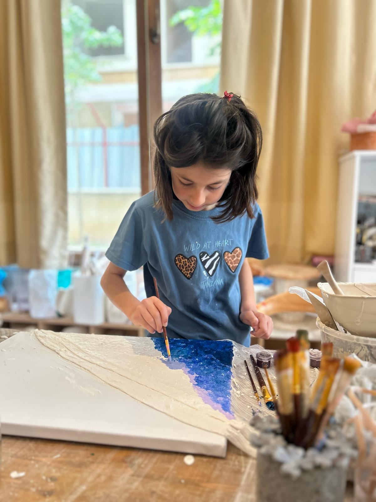 Resim atölyesinden farklı olan dokulu resim atölyesi birden fazla ürün ile tanışmış olacaktır konuya uygun tuval üzerine alçıdan ve tülden tasarlayacakları esere ek olarak akrilik boyalar ile renklendirip taşlar ve simler ile de resimlerine renk katıp çok farklı bir resim elde edecekler.