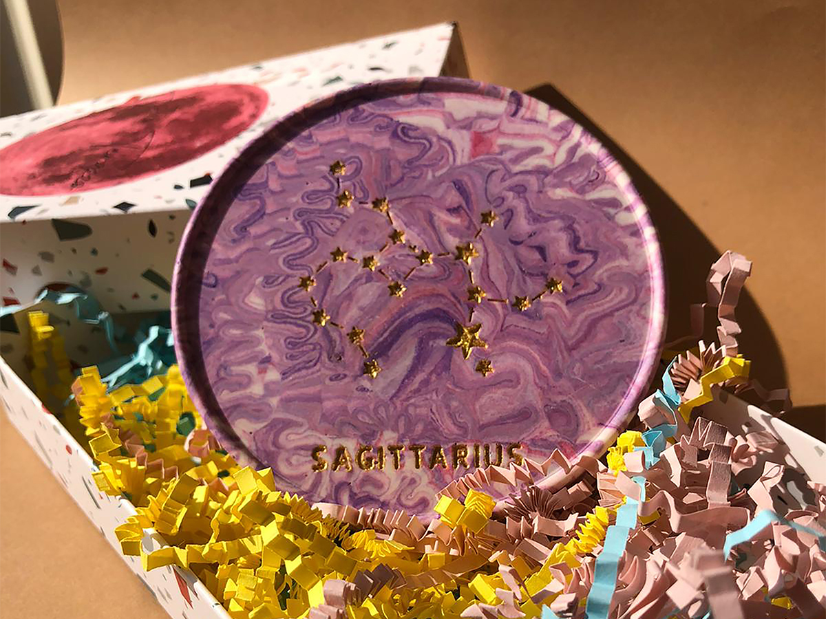 Yay burcunun gezgin, neşeli ve bilge enerjisinden ilham alarak tasarladığım bu özel parça, morun güçlü tonlarıyla hayat buldu.